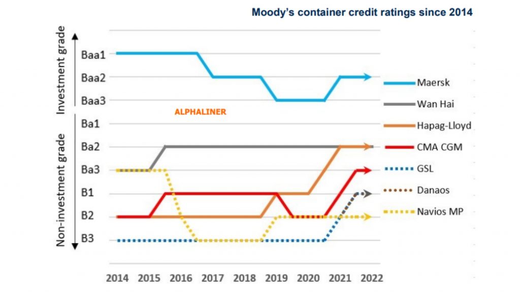 Since Alphaliner’s last survey in April 2021, three companies have received upgrades from Moody’s, including CMA CGM from B1 to Ba3 (three notches off investment grade) together with NOOs Global Ship Lease (GSL) and Danaos from B2 to B1.