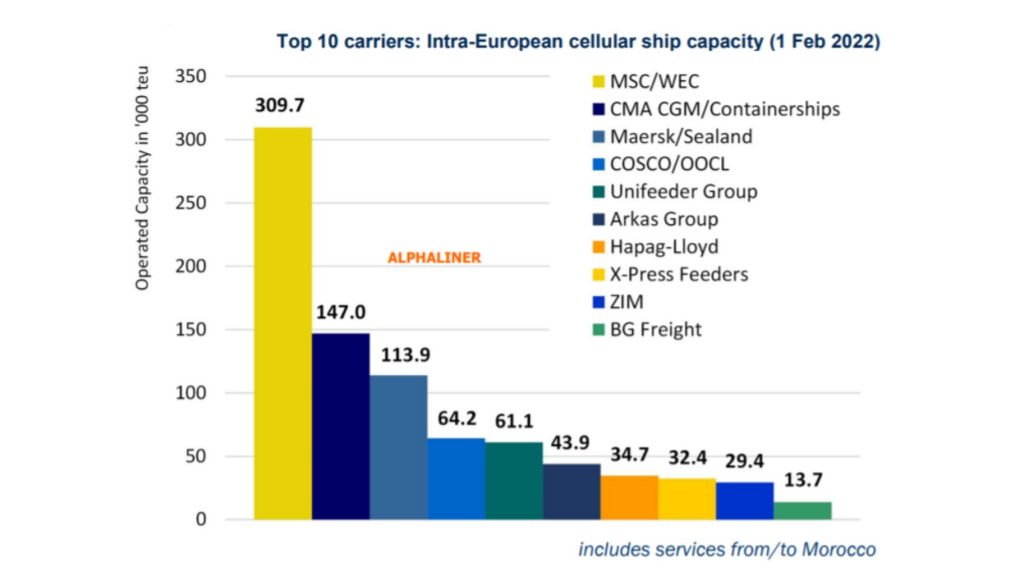 MSC, who in early January took the top spot in the Alphaliner Top 100 from its rival Maersk as the world’s largest ocean #carrier by operated capacity, has by far the highest market share of all carriers in the intra-European service segment. Its share reaches 31.5%, almost double that of its overall 17.1% global market share.