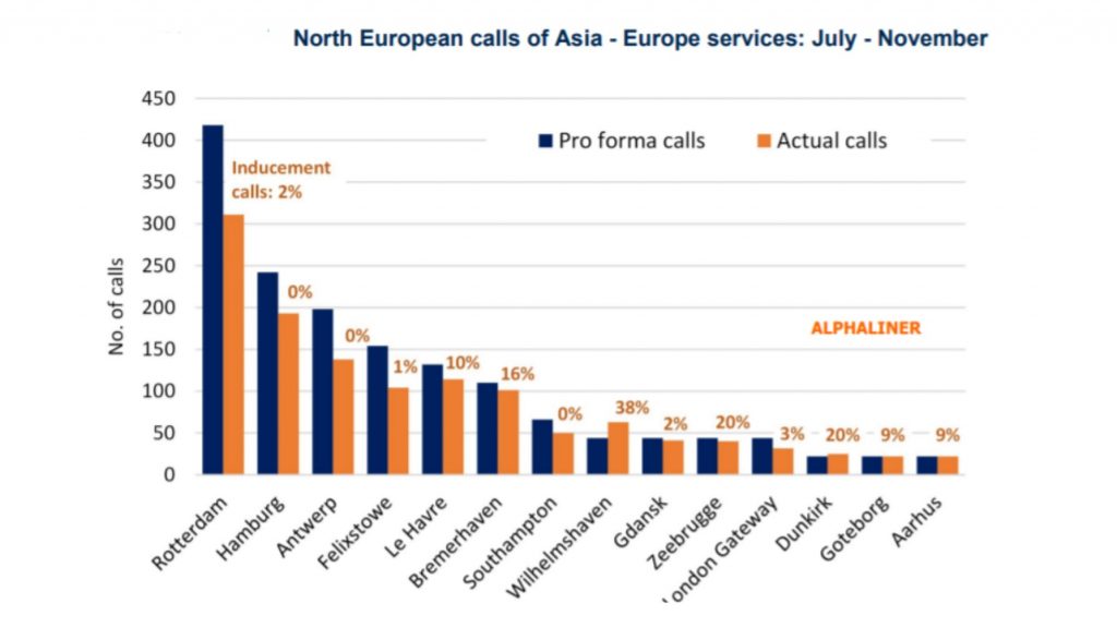 The addition of 77 inducement calls has only partly compensated for these massive port omissions. Alphaliner has compared actual #ship calls in North Europe for the services in the 22-week period between 1 Jul and 2 Dec with the published pro forma schedules.