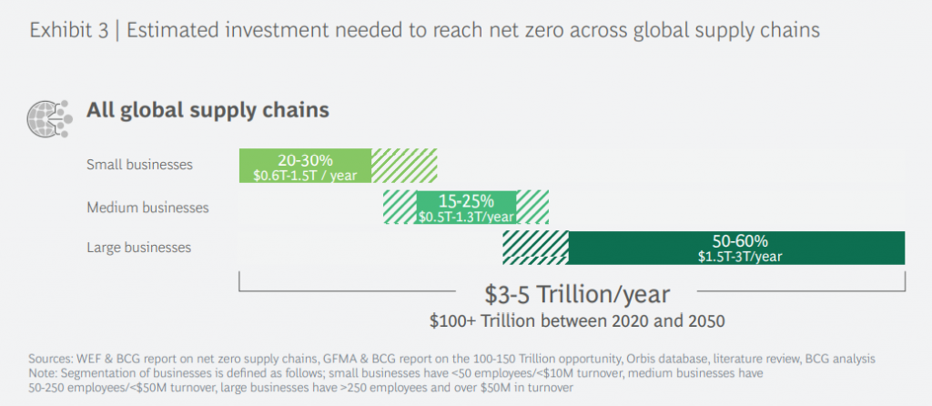Global supply chains will need an estimated $100 trillion in investment to achieve the planet’s goal of net-zero carbon emissions over the next three decades, according to new research that pins as much as half of that price tag on small to medium size businesses.