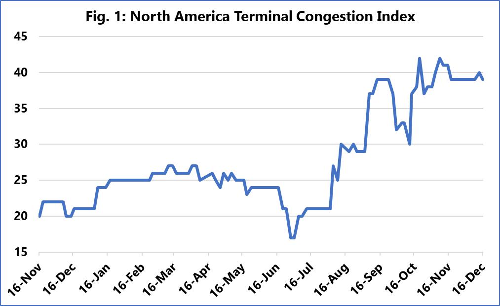The chart shows the Terminal Congestion Index for North America, and we see a development where congestion peaks in mid-September 2021, and then there is a brief temporary improvement in early October. However, this improvement is quickly reversed, bringing congestion to a record-high sustained plateau.
